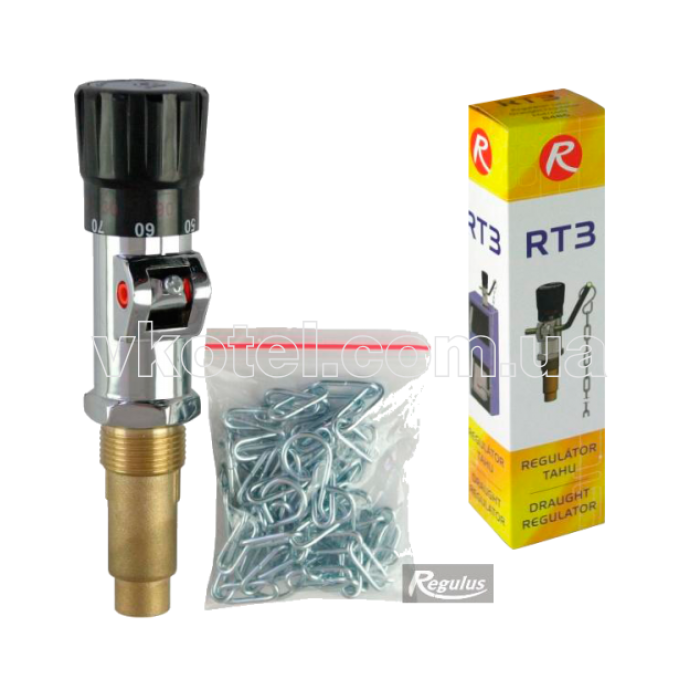 Регулятор подачи воздуха Regulus RT3 используется для независимого управления подачей воздуха в топочную камеру твердотопливных котлов центрального отопления, в режиме температур от 30 до 900С. Термостат регулятора управляет рычагом, который в свою очередь поднимает, или опускает цепь с воздушной заслонкой (закрывая/открывая), механически регулируя обьем воздуха в топочную камеру.