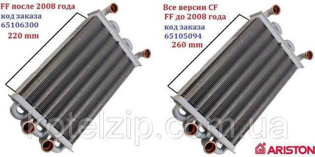 Для димохідної версії котла серії Ariston CF один варіант теплообмінника - 65105094. А для турбованої версії Egis FF може бути два варіанти - до 2008 року випуску довга версія теплообмінника 260мм 65105094 або версія після 2008 коротка 220мм 65106300.