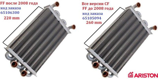 Для димохідної версії котла серії Ariston CF один варіант теплообмінника — 65105094. А для турбованої версії Egis FF може бути два варіанти — до 2008 року випуску довга версія теплообмінника 260мм 65105094 або версія після 2008 коротка 220мм 65106300.