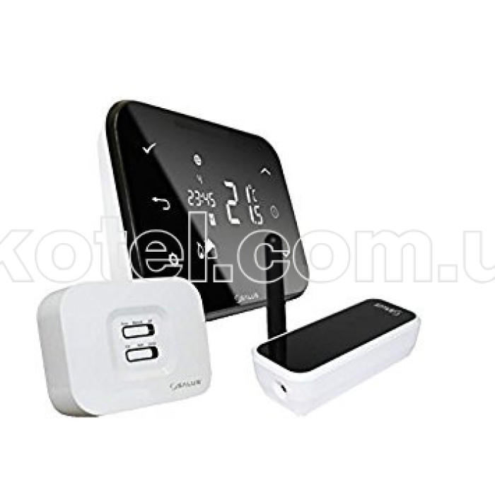 Сам термостат являє собою сучасний терморегулятор із сенсорною панеллю в "хай-тек" стилі, який гармонійно впишеться в будь-який інтер'єр, і бездротового приймача, що передає команди від інтернет-термостата котла. У будинку обов'язково повинен бути Wi-Fi роутер. На телефон (або комп'ютер) встановлюєте програму, яка буде зрозуміла кожному користувачеві. Всі перераховані вище номенклатурні позиції і програмні рішення входять в комплект поставки (за винятком додаткового датчика Salus IT300, що дозволяє розширити можливості термостата до управління 2-ма контурами опалення). Після установки термостата і програми Ви можете дистанційно керувати котлом опалення, підвищувати або знижувати температуру в будинку, включати або вимикати різні опалювальні програми, готувати гарячу воду до Вашого приїзду, стежити за роботою системи опалення.